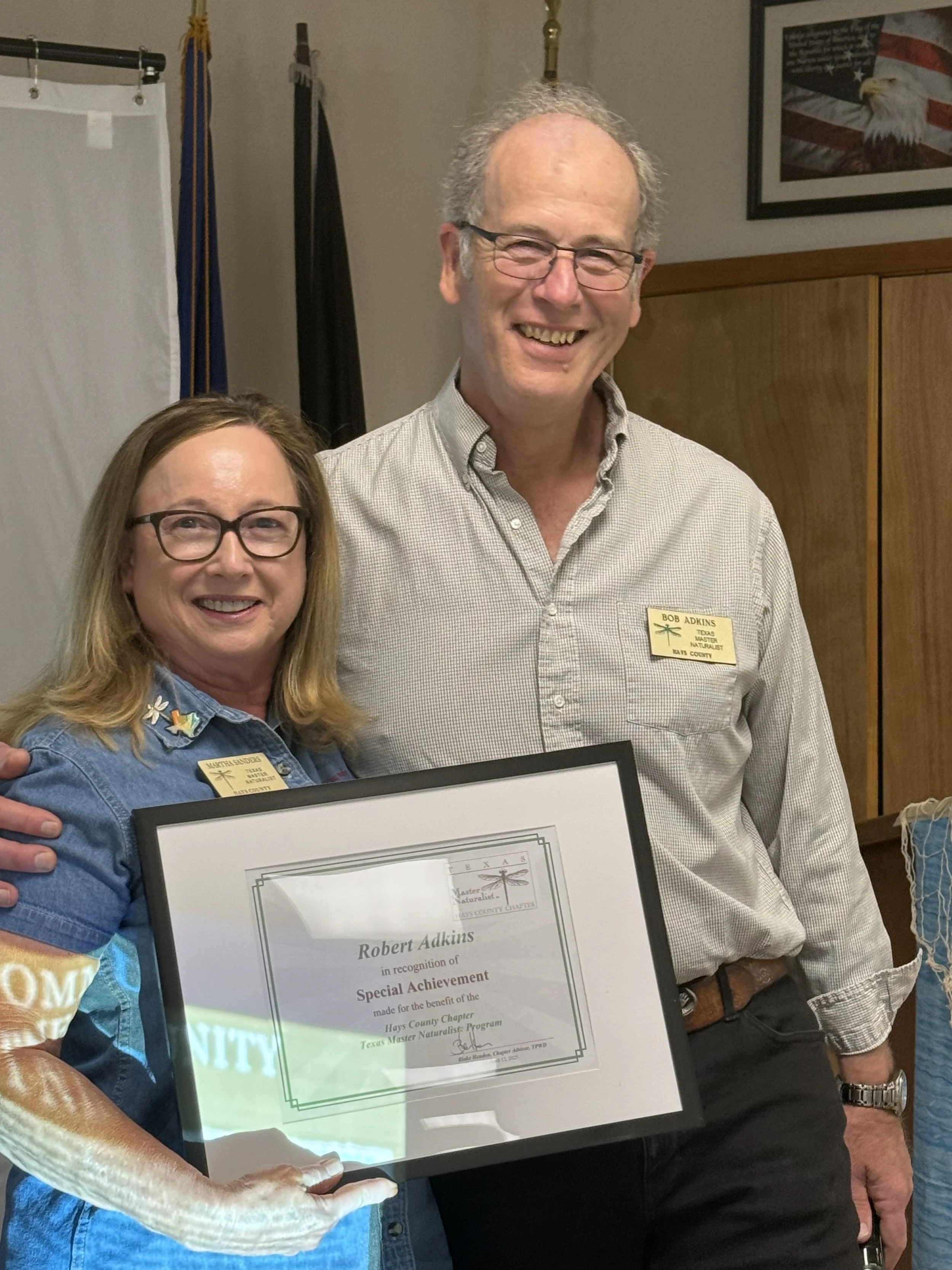 A Special Achievement Award was presented to Chapter President Bob Adkins for his vision and leadership during the 2024 Annual Texas Master Naturalist Meeting, hosted by the Hays County Chapter in San Marcos, Texas.