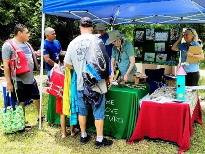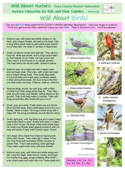 And they could do the scavenger hunt! Around the swimming area’s paved “trail,” the team had placed eight big laminated portraits of the birds these young people and their folks are most likely to see here and in other Hays County locations. Kids walked the trail, spotted the birds in trees, shrubs, or grasses, and checked them on their hunt sheet. An 11-year-old came back triumphant. ”I got ‘em all!” Was it too hard or too easy, we asked. “They could’ve been hidden more, but I guess this is good for the little kids.” Her feedback is important to the WAN nature education teams as we develop more games and materials for a variety of events already shaping up around Hays County for the fall and into next year.