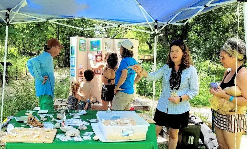 On July 23 the show was Hays County Fossils, including a simulated archeological dig in a sandbox. Team Deb Bradshaw, Debra Kennamer, Jamie Pettit, and Lin Weber hosted more wide eyes and little hands. A party of adult visitors from California were open mouthed at our plaster cast of a Canyon Dam Gorge dinosaur track as big as a coffee table! We’re learning that anything dinosaur is sure to please. And Chris reports: “Deb and Debra discovered the key to drawing a crowd: take something compelling around to the people and invite them to stop by the table. Fossils tallied record numbers—over 80 people!”