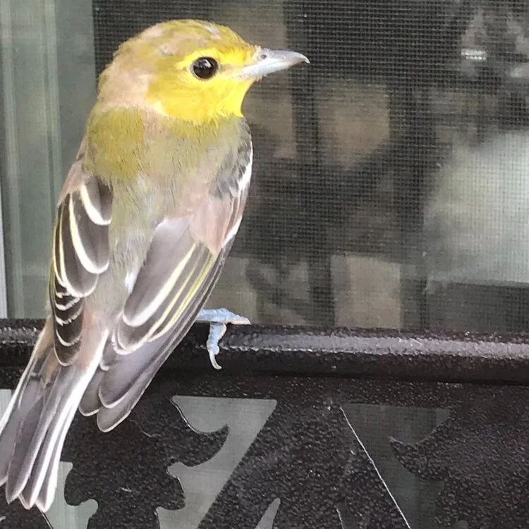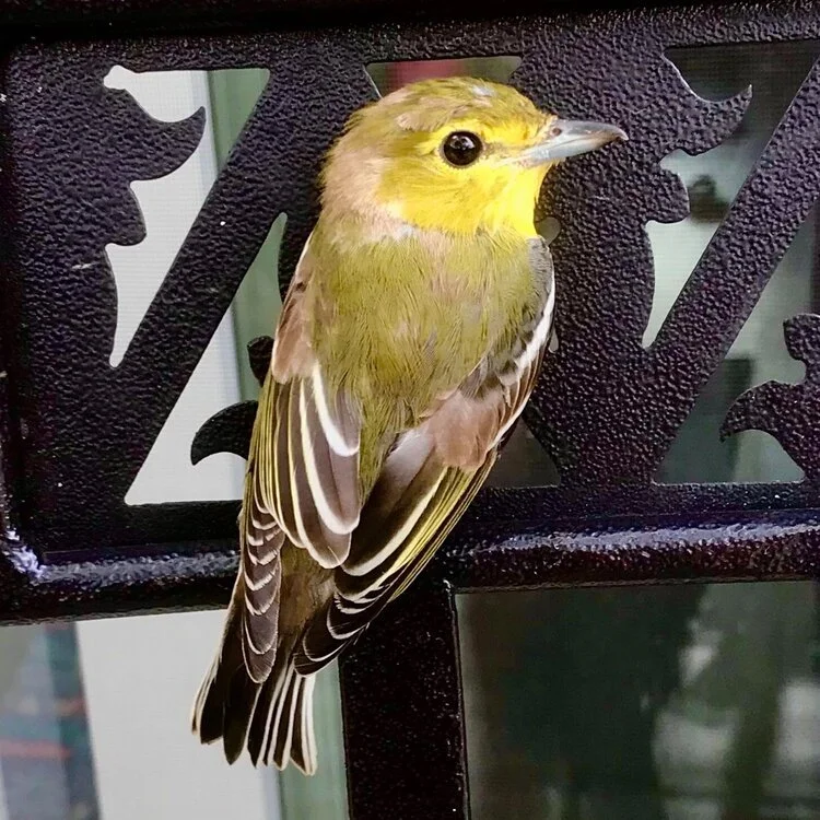 But that’s not the end of this story. In an unrelated conversation with Hays Humm editor Steve Wilder, he told me about a fledgling that he’d photographed with his cell phone. At first he thought it was a goldfinch fledgling, but he uploaded the photo to iNaturalist and received several responses—it was a Yellow-throated Vireo. He sent me the photos below.