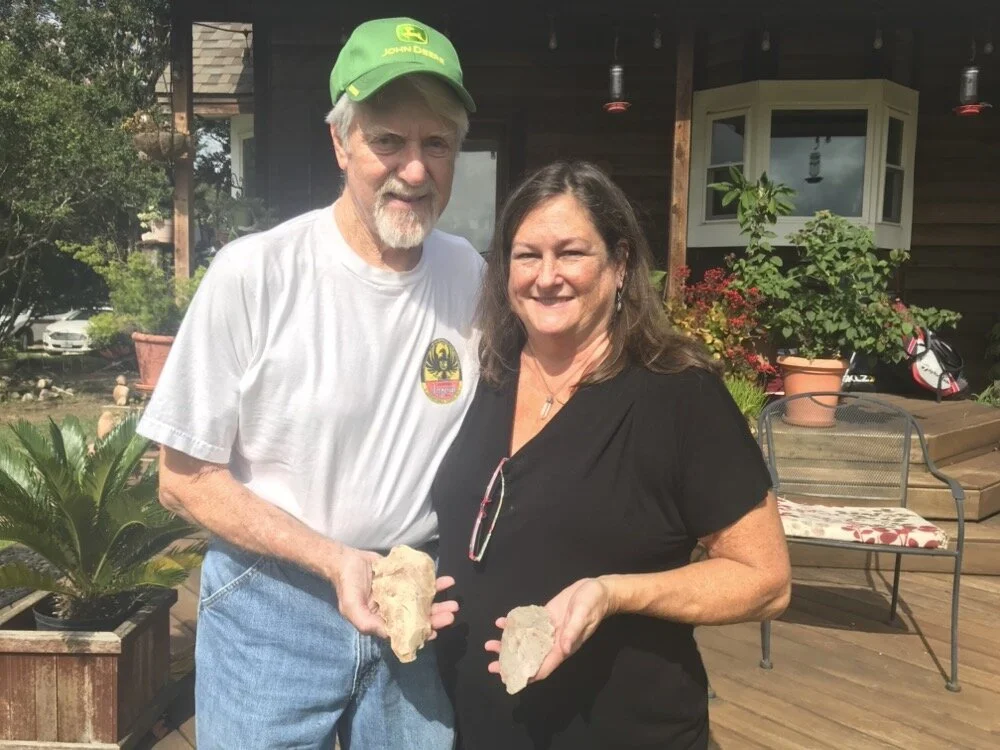 When I arrived Steve and Cecile gave me a tour. The first thing I noticed was their many favorite geodes stacked on the wide patios next to their house. There were rock piles with flint, limestone and geodes created when they cleared their property. The flint was in many different shapes and colors typical of what I have seen at other locations within the Hays County flint belt. Click to enlarge the photo to the right and you can view the large pieces of worked flint they are holding. Cecile is holding a flint tool that looks to be chopper shaped from the flint deposits near their property. Steve is holding a piece of flint that has only been roughly shaped. There is good evidence that early human populations on this site discovered and used the flint from this area in their everyday lives.