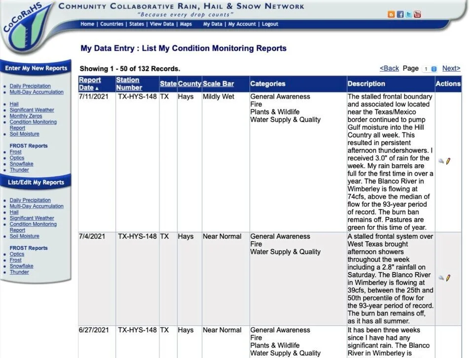 During the pandemic, CoCoRaHS reporting became one of my go to ways of getting Master Naturalist hours (803FR). There isn’t an easier way to pick up 2.5 hours each month. I started doing daily CoCoRaHS reports back in 2016, and in 2019 I upped my game by adding weekly Conditioning Monitoring reports. I was curious to know what percentage of people who submit daily reports also submit weekly summaries. So I reached out to CoCoRaHS directly and they provided me the information I wanted. Over the past 12 months, there were daily reports from 24,680 stations from all 50 states, D.C., Canada, Puerto Rico, and The Bahamas. Texas accounted for ~10% of the reporting. As for weekly Condition Monitoring Reports for the country, there were just 1,705 stations with at least one report, only about 7 percent.