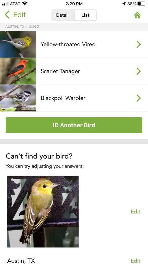 When I need ID confirmation on a bird photo I’ve taken (almost always with my regular camera), I will often upload it to my phone and run it through Merlin’s Photo ID. Compared with images of the Yellow-throated Vireo, Steve’s excellent photos matched well with ID references online. But out of curiosity, I ran Steve’s pictures to see what Merlin had to offer. The confirmation gave me additional confidence that the mystery bird at Jacob’s Well was in fact a Yellow-throated Vireo, that the Yellow-throated Vireo is breeding and thriving across Hays County, and that Merlin’s Sound ID was likely accurate. Thank you, Steve! My next step is to spot one and photograph it for my own records.