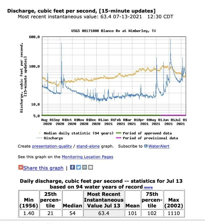 I tend to use the same categories each week: general awareness, fire (e.g., burn bans), plants and wildlife, water supply and quantity. I am particularly fortunate to be located close to a USGS gauge with a 94-year period of record. I compare the Blanco River’s flow in Wimberley (USGS gauge 08171000) to the long-term median (50th percentile) or the 25th percentile of flow. The reason for using these statistics for comparison rather than the average flow is that high flow events during floods skew the average. Stream flow is not normally distributed. Therefore, it is best to use non-parametric statistics such as percentiles.