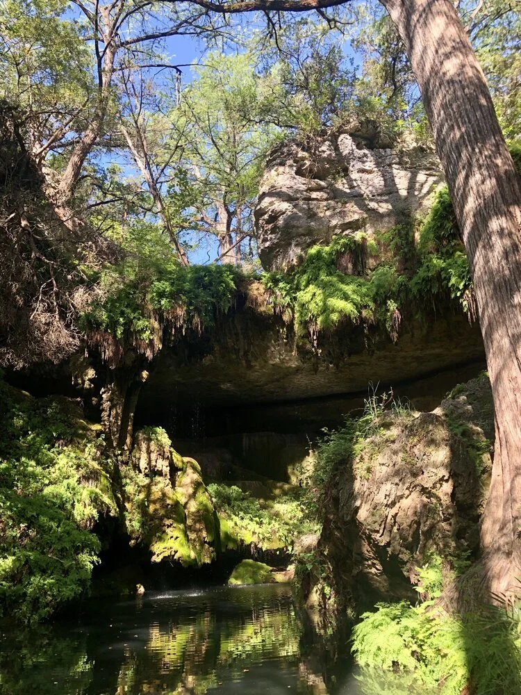 Members of the Hays County Master Naturalist Armadillo class (2021) and friends in the Corona de Cristo class (2020) beat the heat on Sunday, July 25, at one of the Hill Country's finest gems, Westcave Outdoor Discovery Center. Westcave's Lindsay Loftin led the steep descent down to the gorgeous Grotto and asked the trainees to cup our hands behind our ears to practice active listening far from the ceaseless weekend traffic along Hamilton Pool Road. She asked, "How many distinct natural sounds can you identify?" The swishing of the enormous cypress trees, the calls of wrens, titmice, and chickadees, and the soft trickling of the creek created a soothing listening experience. As we reached the bottom of the canyon, we were greeted by perhaps the greenest oasis in the Hill Country. The waterfall cascaded into the pool below, and the lush greenery framed a scene straight out of Jurassic Park (pre-dinosaurs, of course). Trainees ascended the rocky stair to revel in the view from behind the waterfall and the comfortable temperature of 76°F there. In the adjoining cave, the temperature dropped to about 72°F—a wonderful reprieve from the blistering world above. We admired the cave formations and practiced active listening again to appreciate the soundscape of the slow drips of water in the cave.