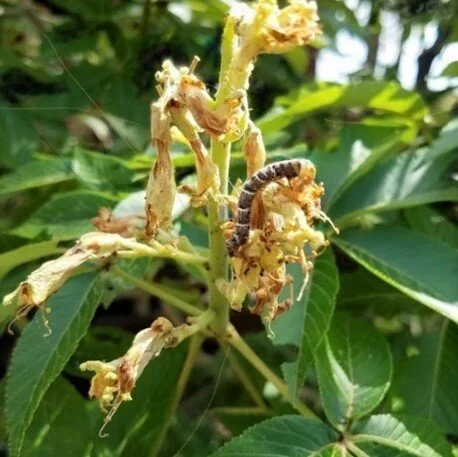 The zoo of larval invaders included two variants of a caterpillar generically termed “oak leaf rollers.” They’re eyelash-size moth larvae that hatched this April from near-microscopic eggs laid a year ago—in May of 2020—on twig tips. They hatched this spring among the tenderest new oak leaves, which they rolled or folded over and sealed with silk. Inside, they began eating, denuding twigs, branches—whole canopies! We see them every year but rarely in such alarming numbers. Two species of natural predator wasp were suppressed by February’s sustained hard freeze; with the reduction of two wasps, look at the ecological impact!