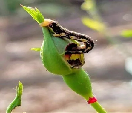 These on black were stripping one oak motte. Getting that shot was like herding cats. Notice the fierce-looking horned instar, lower right corner. The second collection were all together on one small red climbing rose. In the second photo, that pale larva in the center is like our “mystery cat” near the end of this journal. Is this one pink because she’s full of roses?