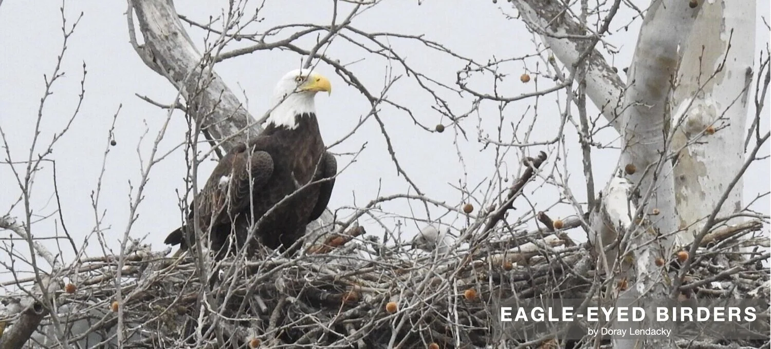 Ever heard the phrase, “The best camera is the one you have with you at the time you need it?” Well, on January 23, I was with fellow birders Lynne Schaffer and Susan Evans for a Christmas Bird Count when I panicked. We stumbled upon a humongous nest, and before our very eyes was the majestic Bald Eagle! OMG—of all days to not have my big girl camera! We were able to observe two adults for a good while, and then we noticed small white fuzzy figures in the nest—two eaglets. Lynne was able to get the shot of the adult with one of the babies (above.)