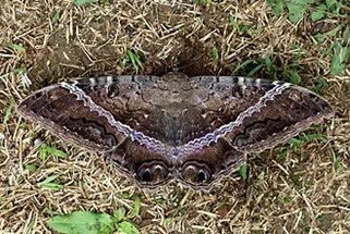 What would a Hays Halloween be without a witch? Here’s the Black Witch Moth (Ascalapha odorata), clearly one of the largest moths we have in Texas. In the dark or even in moonlight, her fluttering outline and markings are bat-like; in some languages, she’s known as the Bat Moth or the Death Butterfly. Ranging from the southern United States to Brazil, the adult Black Witch moth feeds on overripe fruit, and its larvae (caterpillars) consume the leaves of plants. Its host plants are many native Texas legumes (bean-producing plants), such as our iconic Mesquite and Bluebonnets; it also likes Acacia species—around here those include Huisache, Palo Verde (Retama), and native mimosas. It attacks our figs and can be an agricultural pest.
