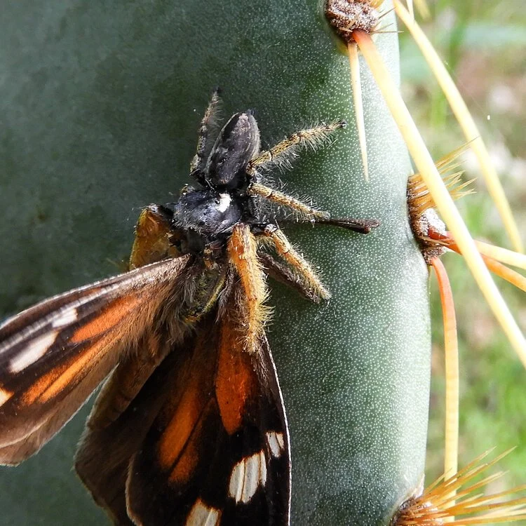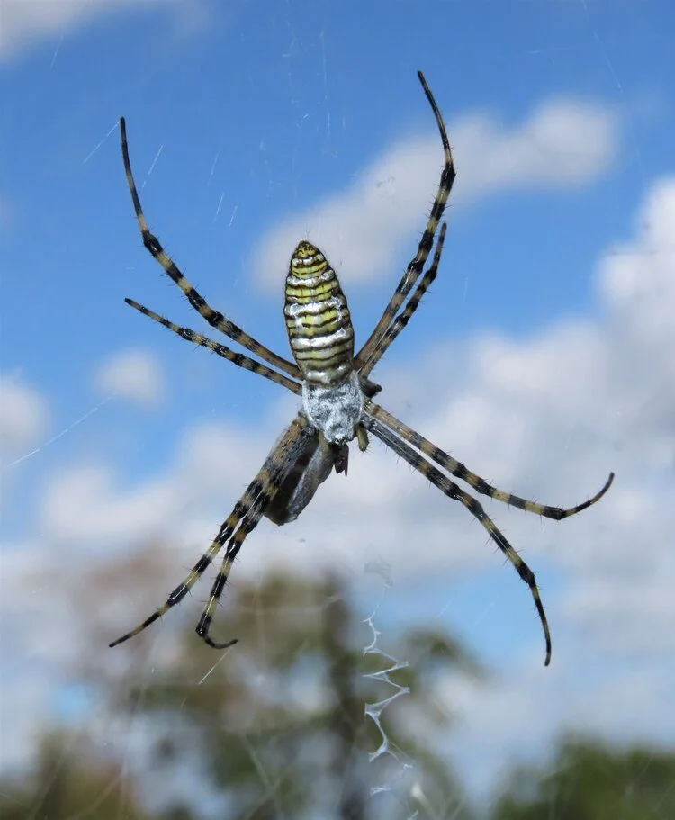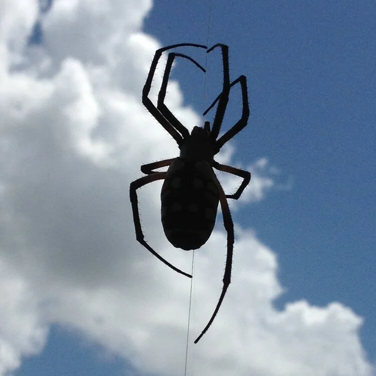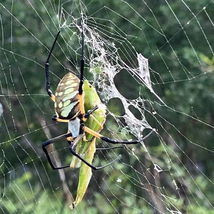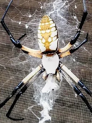 All respectable haunted places are draped in spider webs. Why is it that we buy plastic spider webs to welcome our Halloween trick-or-treaters, but we go eeyuuu! and clobber the spider? What is this irrational fear? No Texas spiders are as venomous as our Black Widow and Brown Recluse, none are fatal to a healthy human, and all spiders would much rather run than bite. But we are a little fascinated, aren’t we? As evident from the many posts on neighborhood message boards this summer, Central Texas has been crawling with “zipper spiders,” also called the Black and Yellow Garden Spider (Argiope—Greek for “bright face”). Can’t help but admire this very common Texas spider with its multiple subspecies and color variations. All spider species’ females are larger than the males; Argiope males’ bodies are only ¼ inch long, but the females’ are at least four times that and broader, like this big girl in the photos. They hang out under our house eaves with its juicy moths, on huge elegant masterpieces of animal engineering with that zig-zag zipper woven right down the middle—nobody is sure why. But there are guesses and lots more cool spider info here. Put a pack of these master weavers to work for you and you’ll never have to shop again for Halloween décor! Keep that plastic out of the landfill. You think I’m kidding.
