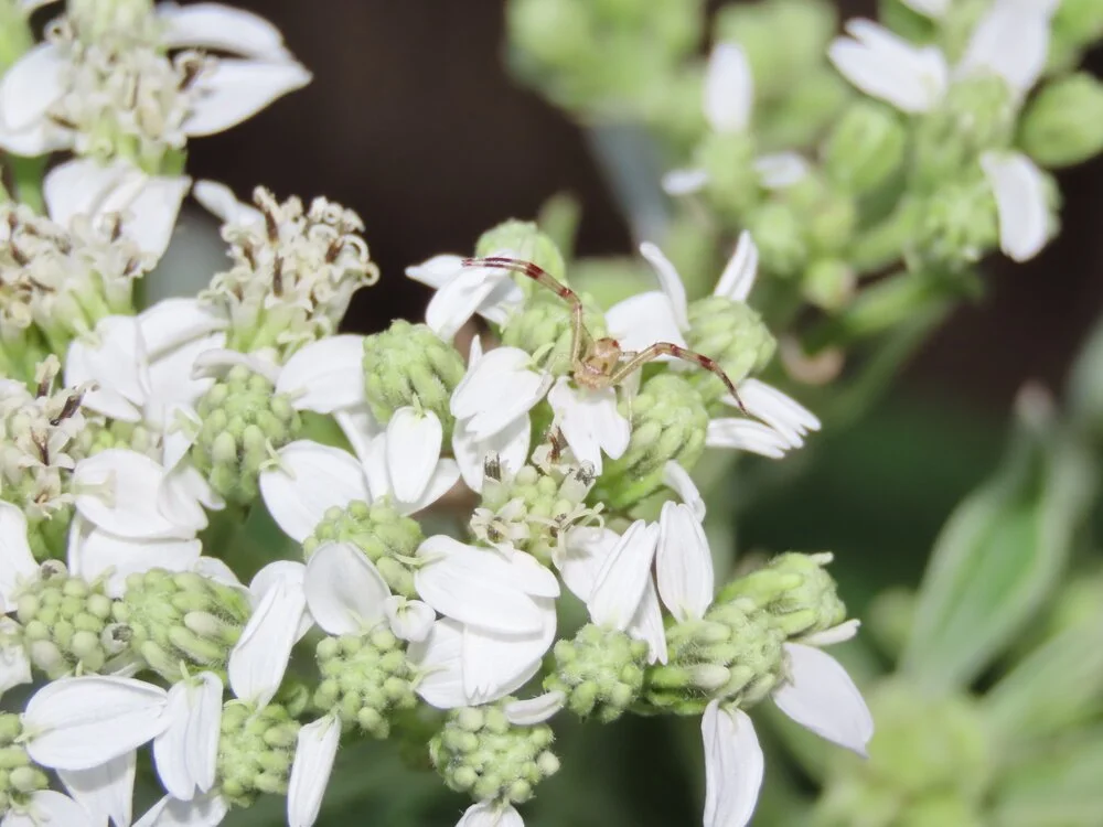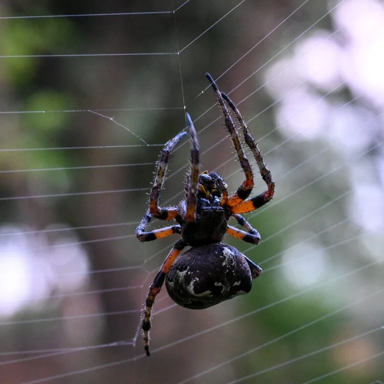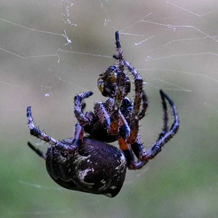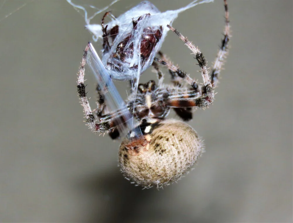 …look it up and then take a close look at the photo below. A spiral extends from a tightly spun center or “hub.” It circles around and around to create a perfect tension of support. Moving in a clockwise direction, this spiny orbweaver stops every few seconds to tack silk to the spokes (or radial lines). It takes less than a minute to make one revolution in its new web hung between the eave of my house and an adjacent tree. A given weight of spider silk is five times as strong as the same weight of steel, but this new web is also fragile and exposed. It may only keep its integrity a day or two.
