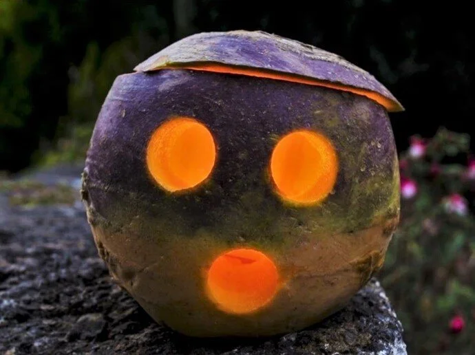 These things never turn out well. Exactly one year later on Halloween night, the Devil came to claim Jack’s soul. The old reprobate was doomed to walk the earth for an eternity of Halloween nights with a single coal ember to guide his ghostly way. He dug up a large turnip from a farmer’s field, carved the first Jack-o’-lantern, and placed the coal ember inside. Jack’s wandering ghost became known as Jack of the Lantern, or in Irish dialect, Jack O’Lantern.