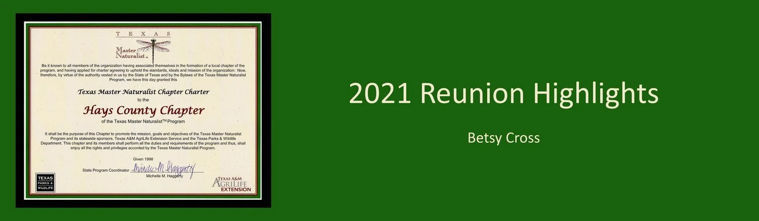 “We started the Hays County Master Naturalist Chapter in 1998, with the first class graduating in 1999. And after all these years, we have finally received our Charter.”—Susan Neill, President