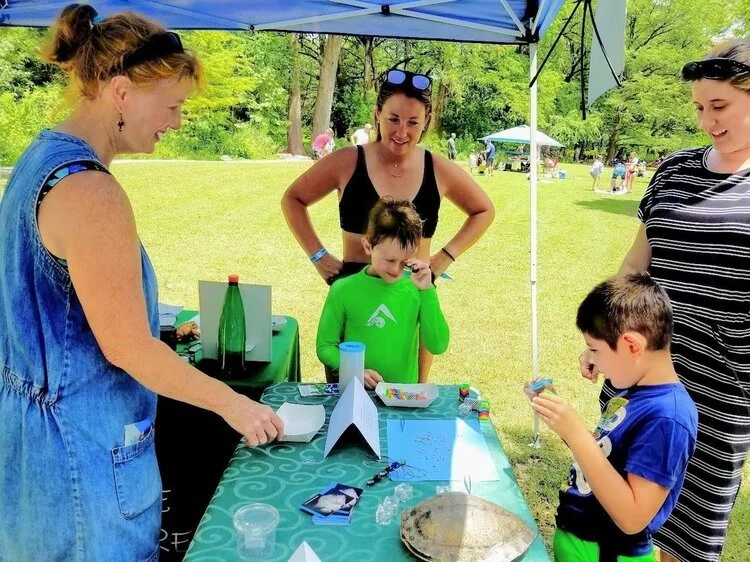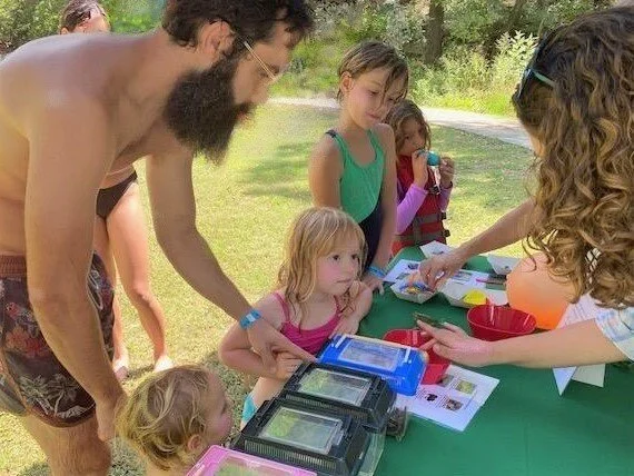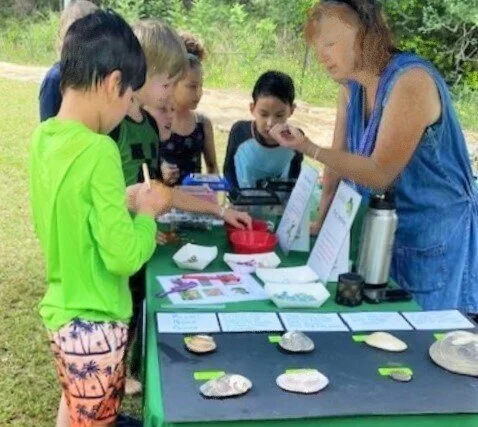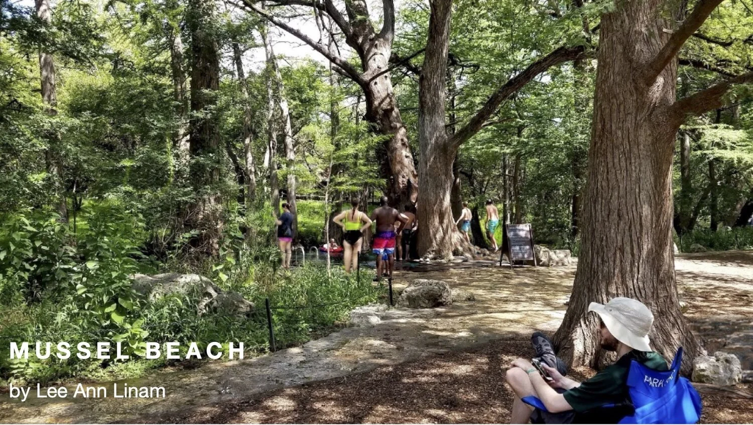 On a hot August 6, 2021, a team from the Hays County Master Naturalist education outreach program Wild About Nature (WAN) helped picnickers and swimmers at Wimberley’s Blue Hole get to know some members of local aquatic ecosystems. Our display wove trophic levels and food webs into encounters with Central Texas aquatic creatures. The exhibit offered kids and their parents hands-on activities to acquaint them with freshwater mussels, turtles, frogs, and dragonflies.