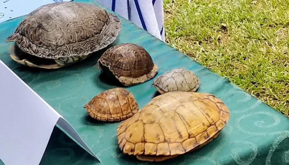 Ornate Box Turtle—Visitors to the turtle exhibit were challenged to identify one other local turtle, one that was not aquatic. Did you guess it? The very domed shell of Texas’ Ornate Box Turtle actually has a hinged plastron that can completely close up, giving these turtles of the woodlands and prairies their name. Another term you may have heard is "terrapin." In North America, the terrapin is a handsome mid-sized spotted turtle found in brackish water—the diamondback terrapin. Yep, now you can talk Texas turtle, tortoise, and terrapin too!