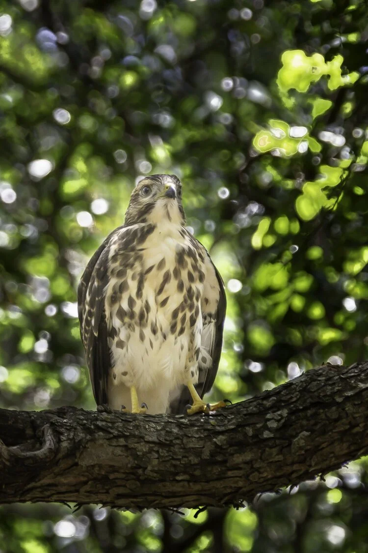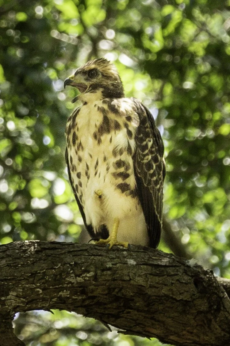 A few days later, the juvenile perched on a limb not far from the nest. What drew my attention to the young hawk was a loud clamoring from several other birds. When I investigated the commotion that was disturbing my lunch, I looked to a branch in the canopy and saw the subject of the commotion smack dab in the middle of it. This juvenile hawk did not move to strike back or in any way confront these smaller yet quite noisy birds, and they finally quit.