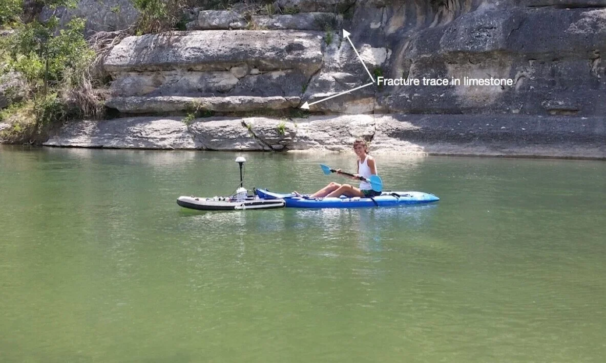 Pleasant Valley Spring — Kendall Yates, Research Assistant with the Edwards Aquifer Authority, measuring the flows at PVS. In the background you can see the fracture associated with the spring on the rock outcrop.
