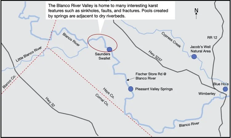 I considered writing an article on the Blanco River shortly after Betsy and I took over The Hays Humm. I was new to finding topics every month, so the Blanco River seemed to be obvious. However, I was worried that, because the river is so familiar to many in Wimberley and Hays County, there would be little interest. Also, since access to most of the Blanco is on private land, I had few opportunities to see and explore it. Although the Blanco River flows 87 miles through the Texas Hill County, I wanted to find a small interesting stretch of the river in Hays County for my article. I found what I was looking for on the upper Blanco River segment in the northwestern part of Hays County. The area includes the stretch from the Little Blanco River entry to Saunders Swallet. Check out the map below to see to see how this area fits into the Wimberley Valley. This “loosing” segment is best known for its river water entering the underlying bedrock, filling the near-surface aquifers. The reality is that during low rainfall months the Blanco River is hardly flowing at all. It is reduced to a series of pools, each one fed by one or more springs. This results in dry river stretches between the springs.