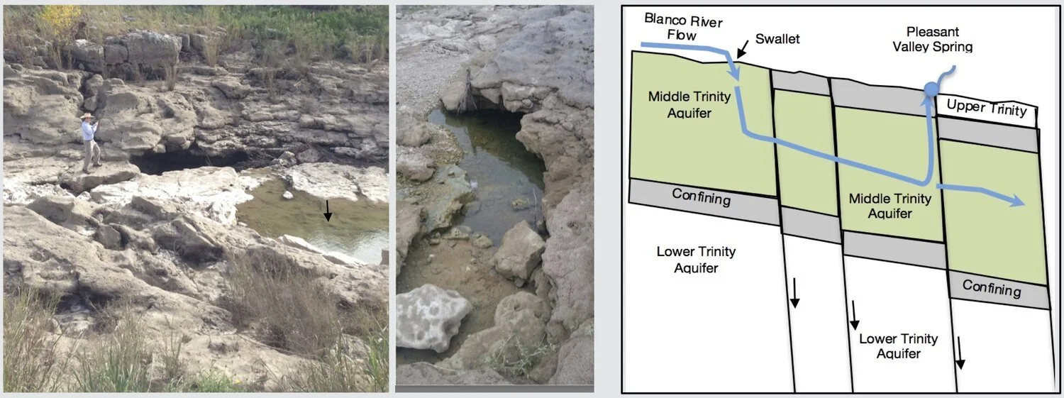 Saunders Swallet is a vital karst feature in the upper Blanco River. It’s an easy path for water entry into the Middle Trinity aquifer. The water seems to disappear from the surface. Groundwater moves through the aquifer, returning some of its flow to the downstream Blanco River at Pleasant Valley Springs (PVS). The remainder of the water continues to flow through the aquifer towards San Marcos, ultimately providing recharge to the famous Edwards Aquifer.