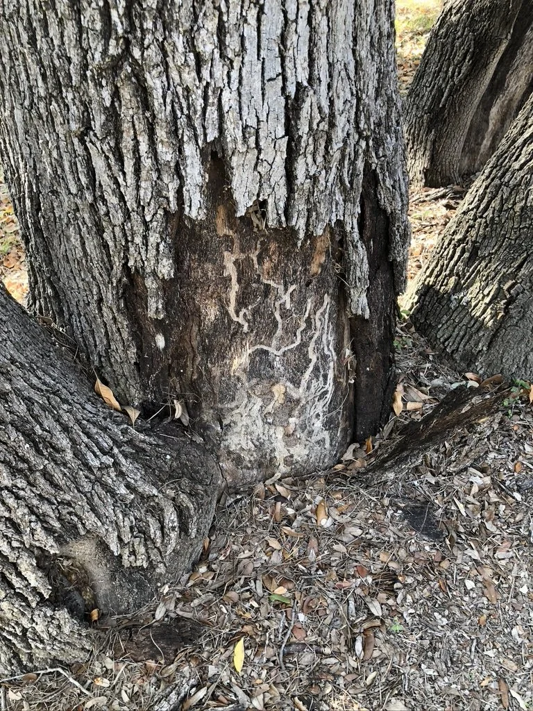 Fungi and other pathogens can affect trees in a variety of ways. On one of our HELM visits, the landowner asked us about a tree that was shedding bark at its base. We consulted the Texas A&M Forest Service. Based on the picture we sent, Woodland Ecologist Karl Flocke explained that most likely a fungus was causing the cambium layer to die, thus robbing the bark of its support. He further suggested that the large amount of organic material piled up as mulch around the base of the tree was likely the reason the bark rot had developed. The solution he suggested was to excavate around the tree down to where the trunk begins to flare into the root system. When putting mulch around a tree, we should not pile it up against the trunk.