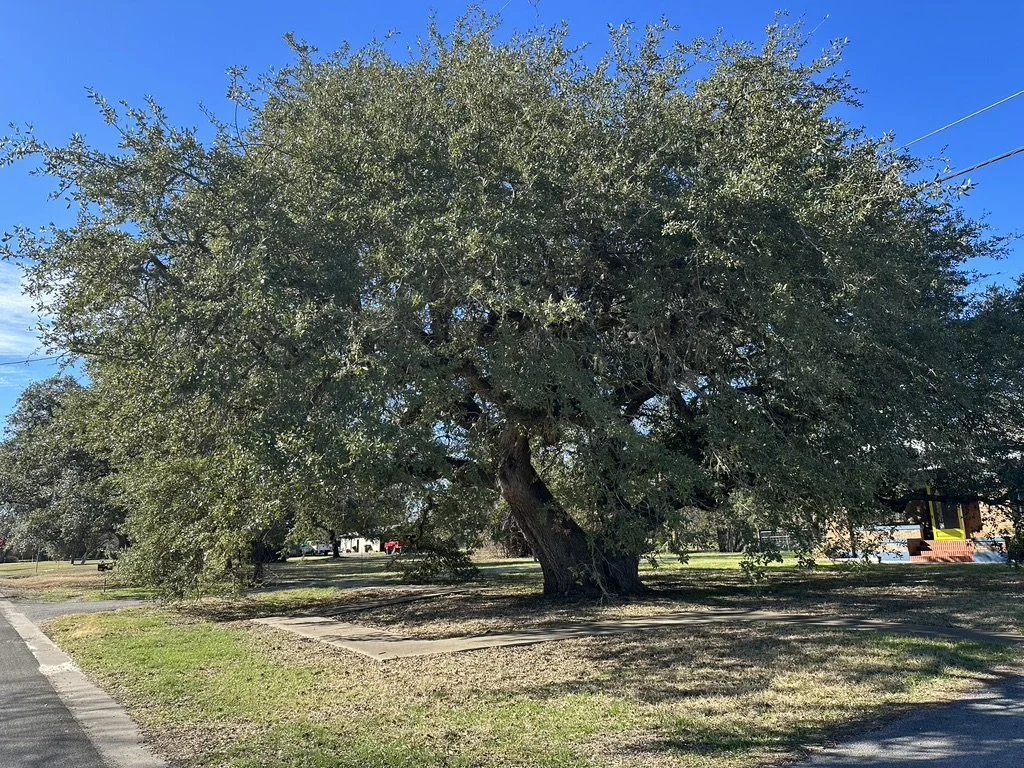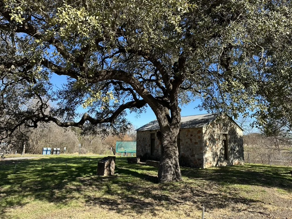 Our dominant oak species here in Hays County, the Escarpment Live Oak (Quercus fusiformis), reaches 20 to 60 feet tall. Bald cypresses, sycamores, pecans, cedar elms, and many of our oaks, when in deep soils with sufficient moisture and allowed to attain “old growth” size, are among our most imposing trees. Soils deepen the farther east we are in Hays, away from the soil-poor caliche and limestone terrain in western Hays County. So it’s no surprise that most of our big trees are in central and eastern Hays. Many of them have witnessed our region’s history. Four of them are listed on the Texas A&M Forest Service’s Famous Trees of Texas website: Kissing Oak, Kyle Auction Oak, Kyle Hanging Tree, and Log Cabin Oaks.