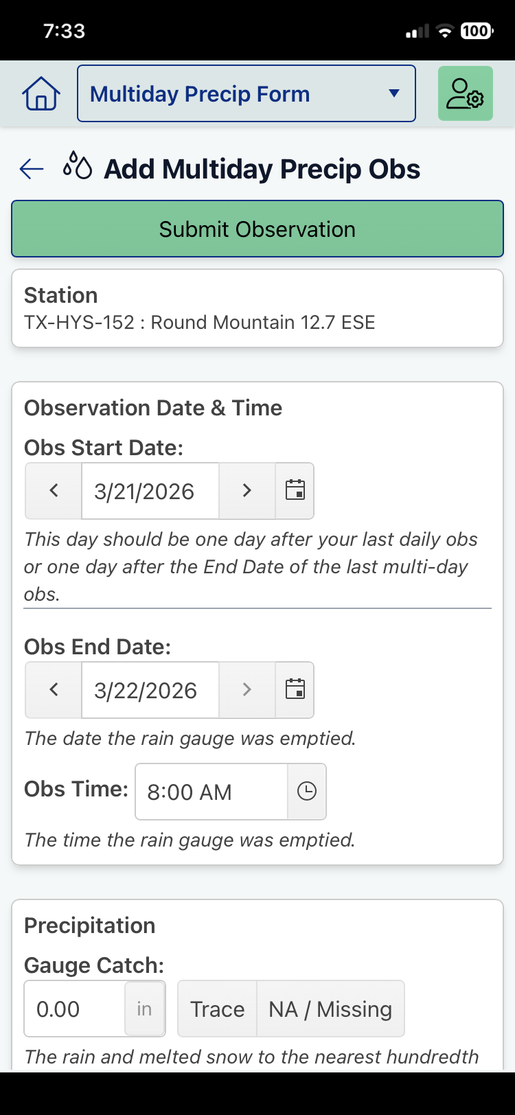 4 - If you are unable to record obs for several days in a row, you will use the Multiday Precip Obs screen shown here.
