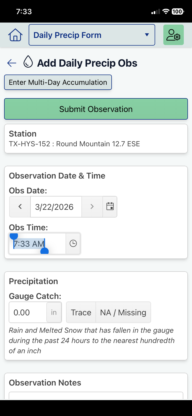 2 - Click on the clock icon to enter your Obs Time, then enter the rainfall/precipitation total for the prior 24 hours.