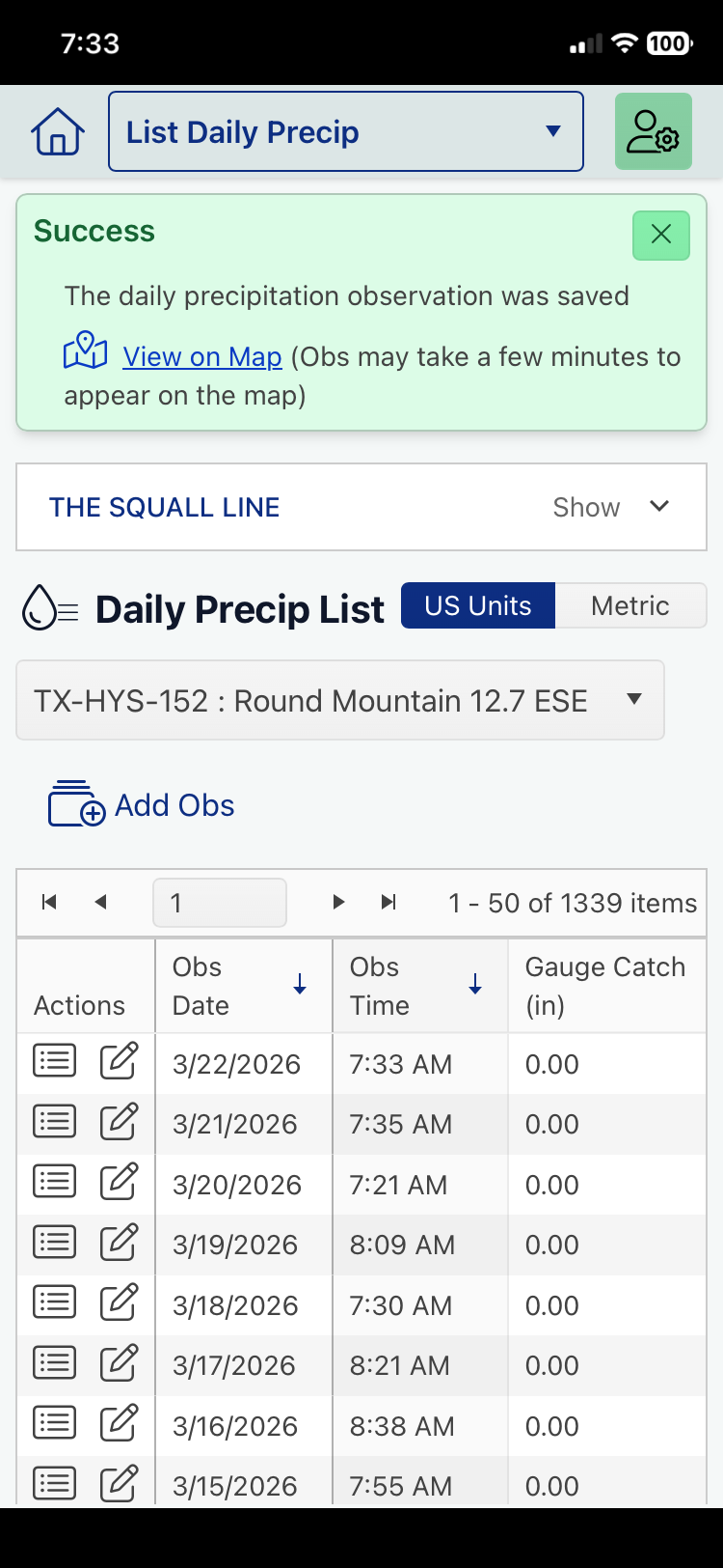3 - This screen shows the running list of data logged for all prior days. Note that entries for zero precipitation are included.